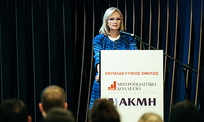 Αναλύοντας το όραμα και τις αξίες που διέπουν την εκπαιδευτική φιλοσοφία του Ομίλου, η κυρία Ροδοπούλου ανέφερε χαρακτηριστικά: «Στον Εκπαιδευτικό Όμιλο Μητροπολιτικό – ΑΚΜΗ επενδύουμε σταθερά στη γνώση και την εξειδίκευση, σε ένα ελληνικό όραμα παιδείας με διεθνείς προδιαγραφές. Πιστεύουμε και αναδεικνύουμε τα ταλέντα των σπουδαστών μας με ανάπτυξη των δεξιοτήτων, με τους ίδιους να κινούνται, να αλληλοεπιδρούν, να ονειρεύονται εξελισσόμενοι σε γόνιμα περιβάλλοντα αξιώσεων και άριστης εκπαιδευτικής δυναμικής. Με υψηλού επιπέδου ακαδημαϊκούς στο πλευρό τους που επανήλθαν στη χώρα από το εξωτερικό για να ενταχθούν στον Όμιλό μας αναστρέφοντας τη δική τους συμμετοχή στο brain drain. Δίνουμε στον σπουδαστή τη δυνατότητα να νιώσει το mentoring, να αποκτήσει άποψη για τις τελευταίες εξελίξεις της αγοράς από σπουδαίες προσωπικότητες του επιχειρηματικού τομέα και διαπρεπείς επιστήμονες από το διεθνές ακαδημαϊκό προσκήνιο. Στην Αθήνα, στη Θεσσαλονίκη, στο Ηράκλειο της Κρήτης και σε όλη την επικράτεια, οι υπερσύγχρονες κτηριακές εγκαταστάσεις μας με βιβλιοθήκες χιλιάδων τίτλων, labs κι εργαλεία εκμάθησης και δράσης, αποτελούν μία συνειδητή ποιοτική επιλογή και καθιστούν τον Όμιλό μας μία σύγχρονη πλατφόρμα γνώσης, τεχνολογίας αιχμής και επαγγελματικής πρακτικής».