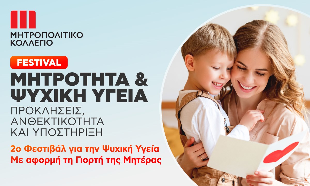 Για 2η συνεχή χρονιά, το Μητροπολιτικό Κολλέγιο διοργανώνει Φεστιβάλ για την Ψυχική Υγεία. Με αφορμή τη Γιορτή της Μητέρας, η φετινή διοργάνωση έχει στόχο να δημιουργήσει έναν ανοιχτό χώρο διαλόγου και ουσιαστικής υποστήριξης, αναδεικνύοντας τις πολλαπλές όψεις της μητρότητας.
