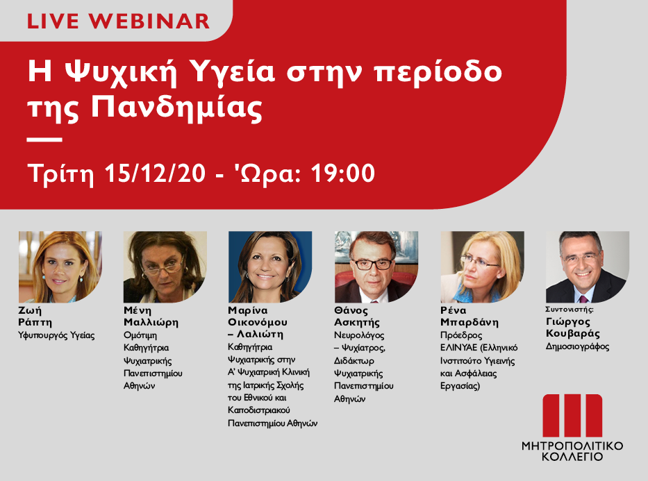 Το Μητροπολιτικό Κολλέγιο, ακολουθώντας την επικαιρότητα της πανδημίας και λαμβάνοντας υπ’ όψιν τον τρόπο που η τρέχουσα υγειονομική κρίση έχει επηρεάσει την καθημερινότητα όλων, διοργανώνει Live Webinar με τίτλο«Η Ψυχική Υγεία στην περίοδο της Πανδημίας».Το Webinar θα μεταδοθεί live την Τρίτη 15 Δεκεμβρίου και ώρα 19:00, μέσω YouTube (για να παρακολούθησετε το Webinar συνδεθείτε εδώ ) και θα φιλοξενήσει πέντε εξέχουσες προσωπικότητες από τον χώρο της πολιτικής και των επιστημών ψυχικής υγείας. Πιο συγκεκριμένα, θα μιλήσουν οι κ.κ.: