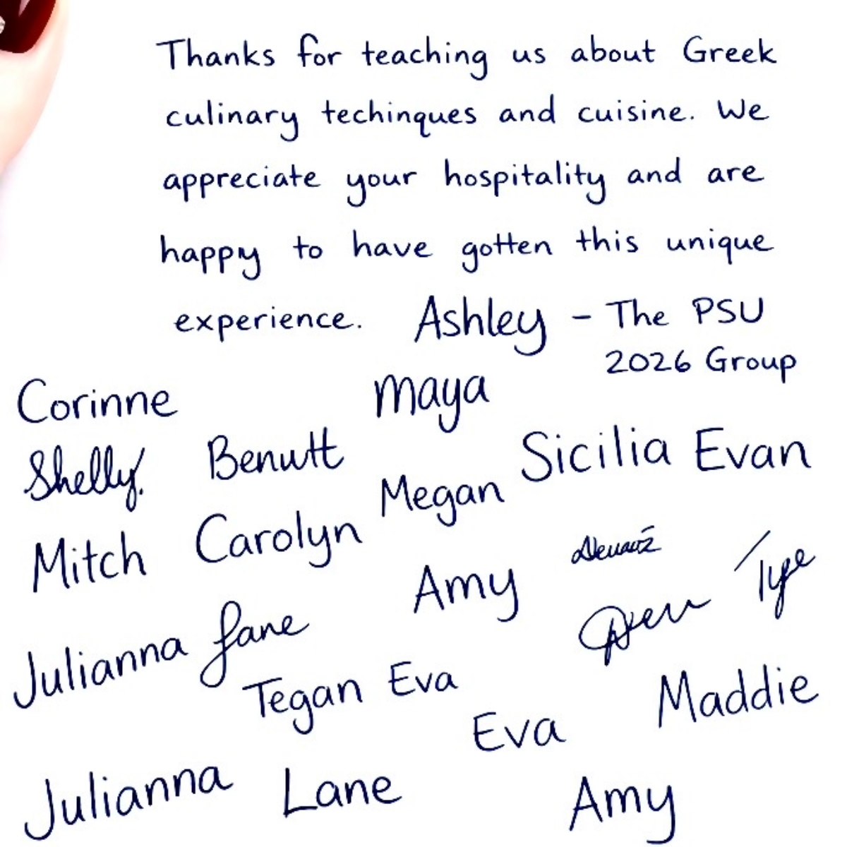 Η δράση ολοκληρώθηκε με τους συμμετέχοντες να απολαμβάνουν το γεύμα που οι ίδιοι δημιούργησαν, σε ένα ιδιαίτερα θετικό και συνεργατικό κλίμα, ενώ ως ένδειξη ευχαριστίας, οι φοιτητές του Pennsylvania State University προσέφεραν μια χειρόγραφη ευχαριστήρια κάρτα.