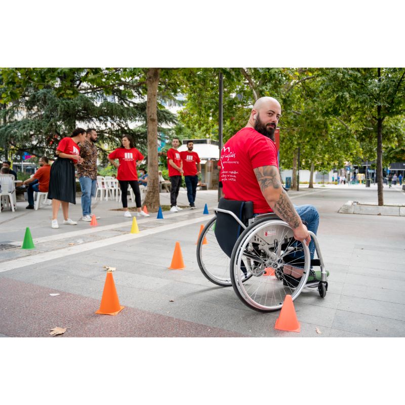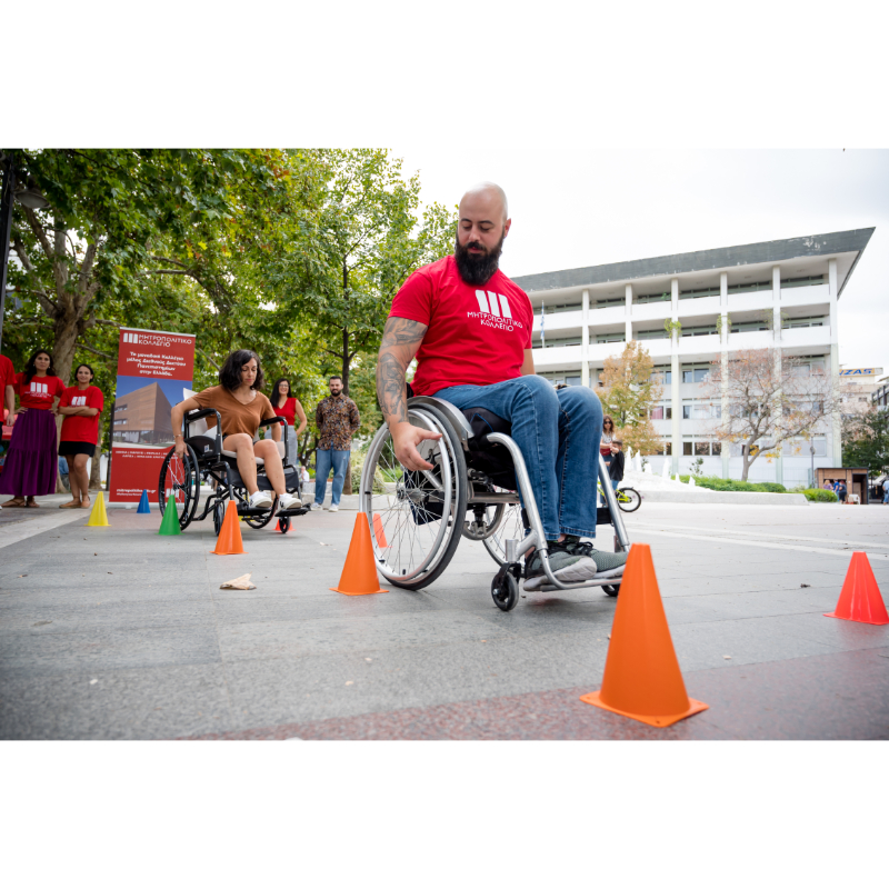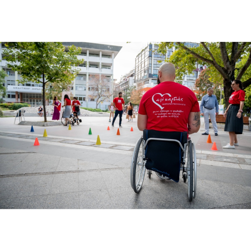 Πιο συγκεκριμένα, οι περαστικοί που συμμετείχαν στη δράση του Μητροπολιτικού Κολλεγίου στη Λάρισα, καλούνταν να καθίσουν σε ένα αμαξίδιο και να διανύσουν μια απλή διαδρομη πάνω σε αυτό, προσπερνώντας κάποια εμπόδια. Η διαδρομή προσομοίαζε τα εμπόδια που συναντούν καθημερινά άνθρωποι σε αμαξίδιο όταν κινούνται από το ένα σημείο στο άλλο. Με αυτόν τον τρόπο, οι συμμετέχοντες είχαν τη δυνατότητα να βιώσουν τις δυσκολίες που αντιμετωπίζει στις καθημερινές -ακόμα και τις πιο απλές- μετακίνήσεις τους στην πολή. Στη δράση συμμετείχε και ο αθλητής Παραολυμπιακών Αγώνων στο ακόντιο, Μπάμπης Βαρυτιμίδης.