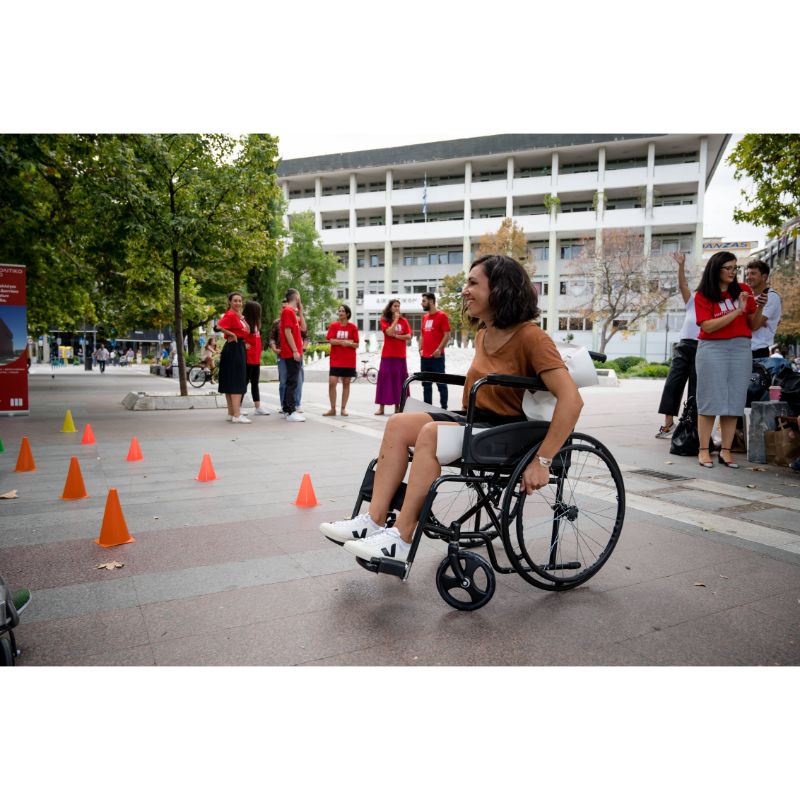 Φοιτητές και καθηγητές από τα προγράμματα σπουδών Ψυχολογίας, Εργοθεραπείας και Φυσικοθεραπείας διοργάνωσαν τη δράση: «Μπες στη θέση μου. Μπορεί μια μικρή διαδρομή να αλλάξει την οπτική μας;». Πρόκειται για ένα διαδραστικό project που, μέσω του βιωματικού του χαρακτήρα, είχε στόχο να ευαισθητοποιήσει τους πολίτες σχετικά με τις καθημερινές μετακινήσεις των ατόμων με αμαξίδιο στην πόλη και, τελικά, να μας “εκπαιδεύσει” όλους στην υιοθέτηση νοοτροπίας και συνηθειών που ευνοούν τη διεύκολυνση των μετακινήσεων των ατόμων με αμαξίδιο στην πόλη.