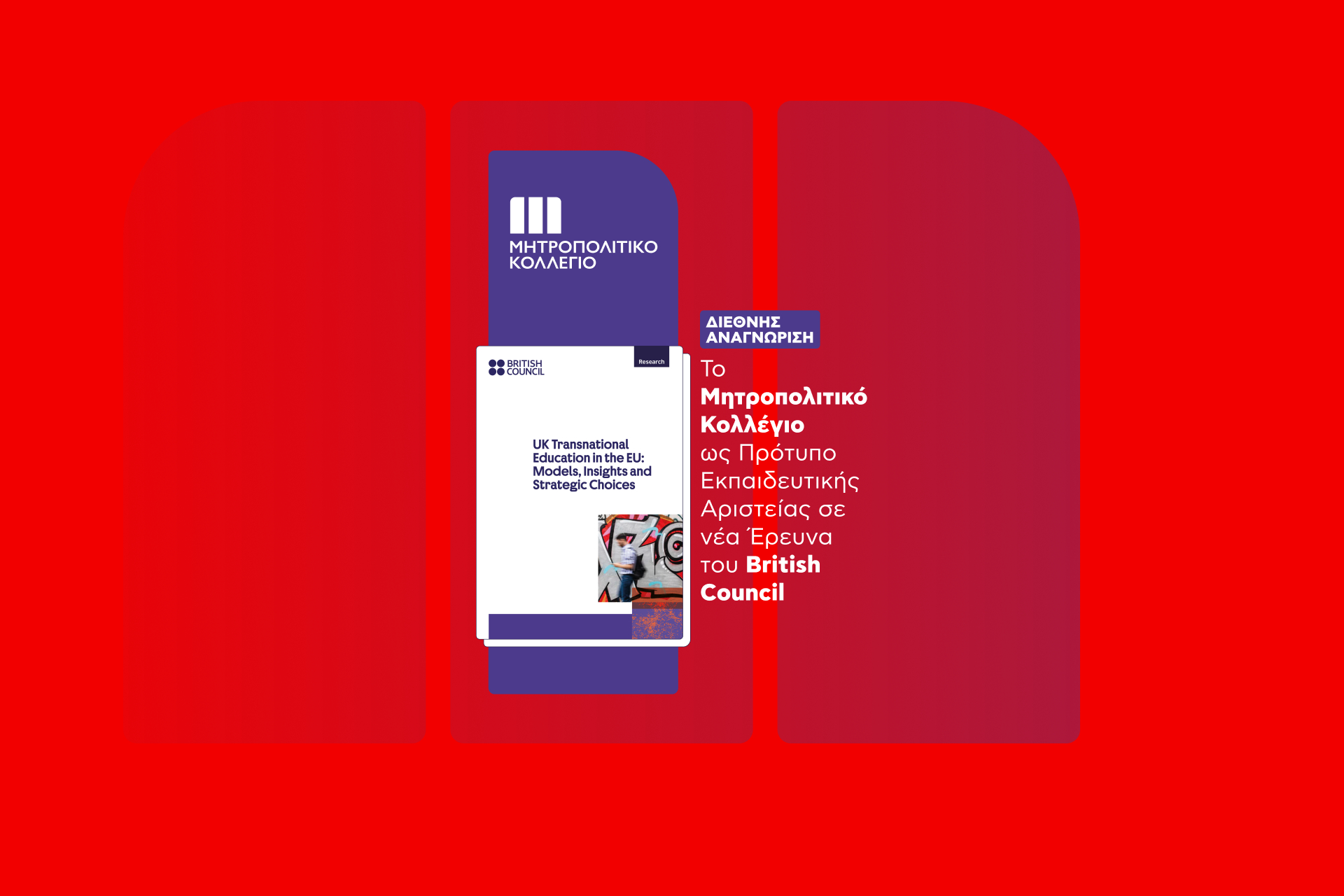 Η νέα διεθνής μελέτη του British Council, με τίτλο “UK Transnational Education in the EU: models, insights and strategic choices“, τοποθετεί το Μητροπολιτικό Κολλέγιο στην αιχμή της διακρατικής εκπαίδευσης (TNE) στην Ευρώπη. Η επιλογή του ως το case study της έκθεσης έρχεται ως συνέχεια προηγούμενων διακρίσεων και αναδεικνύει το Μητροπολιτικό Κολλέγιο ως σημείο αναφοράς για την ποιότητα και την αξιοπιστία της βρετανικής πανεπιστημιακής εκπαίδευσης στη Νοτιοανατολική Ευρώπη.
