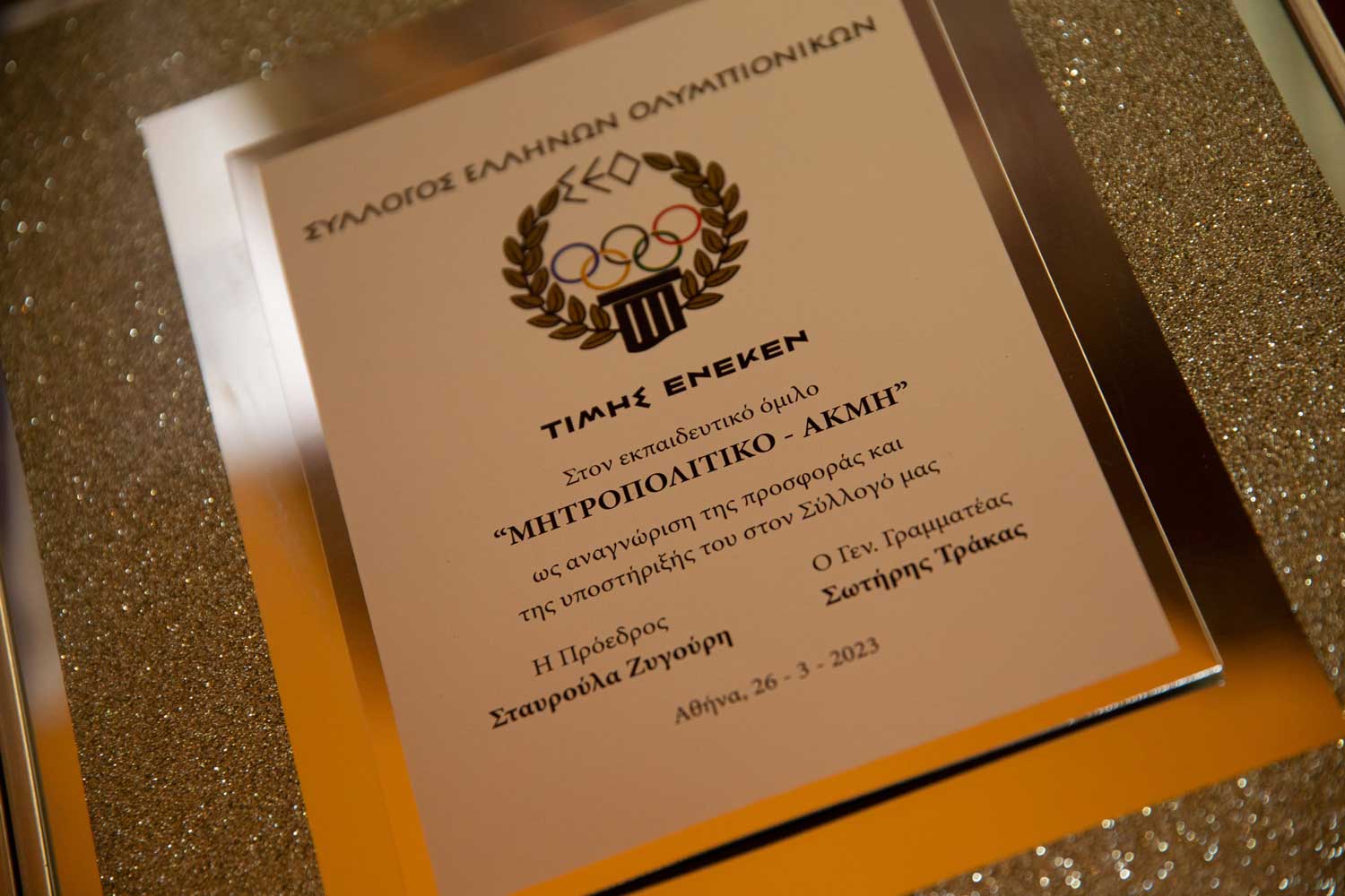 Ιδιαίτερη χαρά και τιμή για το Μητροπολιτικό Κολλέγιο αποτελεί η βράβευσή του Εκπαιδευτικού Ομίλου Μητροπολιτικό-ΑΚΜΗ από τον Σύλλογο Ελλήνων Ολυμπιονικών (Σ.Ε.Ο.), σε ειδική εκδήλωση που διοργανώθηκε στη Λέσχη Αξιωματικών Ενόπλων Δυνάμεων, υπό την Αιγίδα της Περιφέρειας Αττικής. Το βραβείο αποτελεί αναγνώριση της προσφοράς και της στήριξης προς τον Σ.Ε.Ο. με τον οποίο ο Εκπαιδευτικός Όμιλος Μητροπολιτικό-ΑΚΜΗ διατηρεί συνεργασία από το 2020, ως αποκλειστικός educational partner.