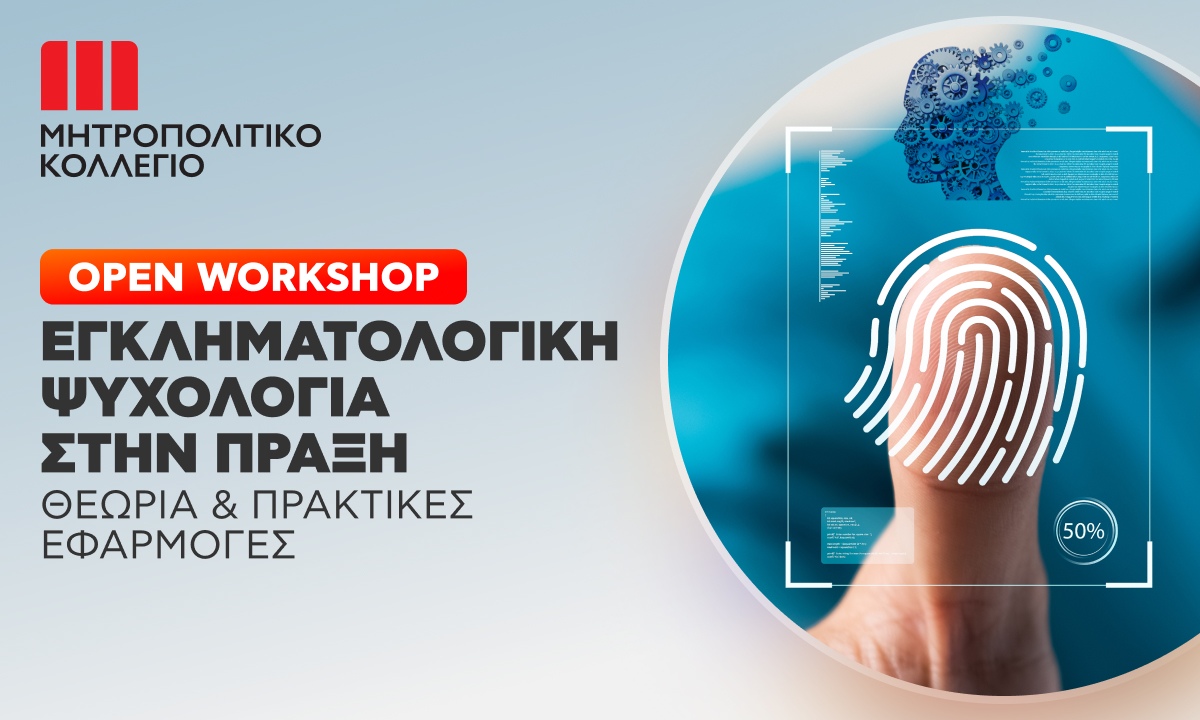 Το Μητροπολιτικό Κολλέγιο, με πρωτοβουλία της Σχολής Ψυχολογίας, διοργανώνει Open Workshop με θέμα “Εγκληματολογική Ψυχολογία στην Πράξη” και δίνει την ευκαιρία σε ενδιαφερόμενους φοιτητές, απόφοιτους και επαγγελματίες να γνωρίσουν την επιστήμη της εγκληματολογικής ψυχολογίας μέσα από ένα δυναμικό, διαδραστικό πρόγραμμα που συνδυάζει θεωρία με πρακτικές εφαρμογές.
